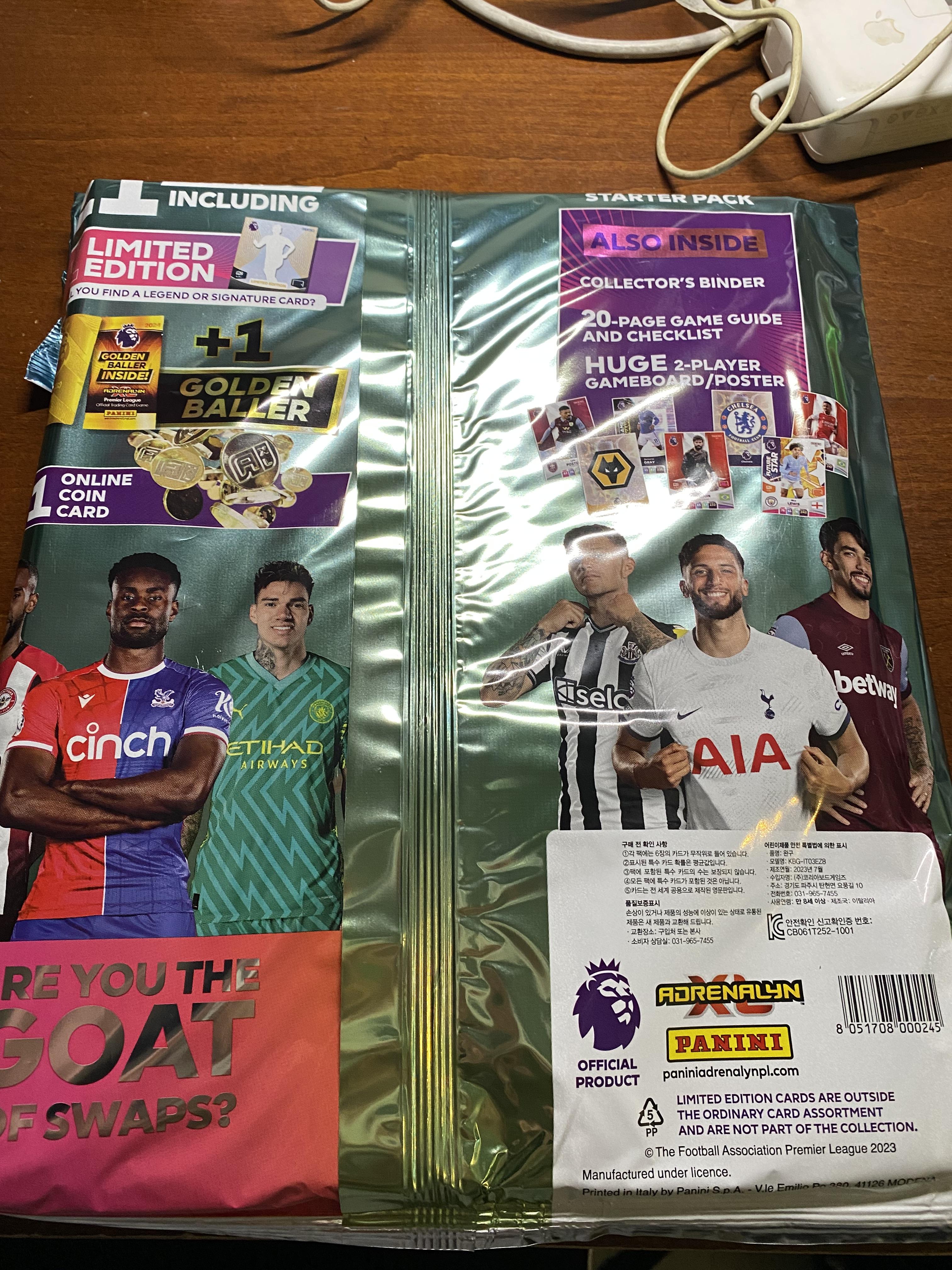 앞서서 언급했던 EPL 2024 스타터팩 구성품들이 다 보이게 해서 찍었습니다. 수집용 바인더 1권, 대형 게임 보드 겸 포스터 1장, 체크리스트와 게임 가우드 북 (영문) 1권, 골든볼러 카드 1장, 한정판 카드 1장, 온라인 코인 카드 1장, 트레이딩 카드팩 3팩의 모습을 전체적으로 나오게 찍어봤습니다. 카드팩에 나오는 카드는 다른 블로그 포스팅에 올리겠습니다. 이상 전체적인 스타터팩 리뷰를 포스팅 해봤습니다.