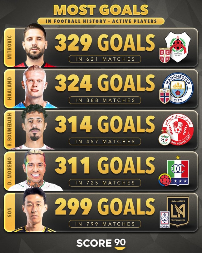 현대 축구 역사에서 아시아 선수가 세계적인 무대에서 두각을 드러내는 일은 여전히 쉽지 않다. 그러나 손흥민은 그 불가능에 가까운 벽을 무너뜨리고, 이제는 세계 현역 득점자 TOP 30 안에 당당히 이름을 올렸다. 축구 전문 매체 SCORE90이 발표한 ‘현역 선수 최다 득점 순위’에서 손흥민은 정확히 30위를 기록하며, 아시아 유일의 이름으로 전 세계 팬들의 시선을 사로잡았다. 이번 순위는 트랜스퍼마크트의 통계를 기반으로 작성되었으며, 리그나 대회 구분 없이 모든 공식 경기 득점을 합산해 만들어졌다. 손흥민은 함부르크에서의 데뷔 이후, 레버쿠젠, 토트넘, 그리고 현재의 LAFC에 이르기까지 799경기를 소화하며 총 299골을 터트렸다. 경기당 0.37골이라는 놀라운 효율을 기록하며 세계적인 공격수들과 어깨를 나란히 했다.