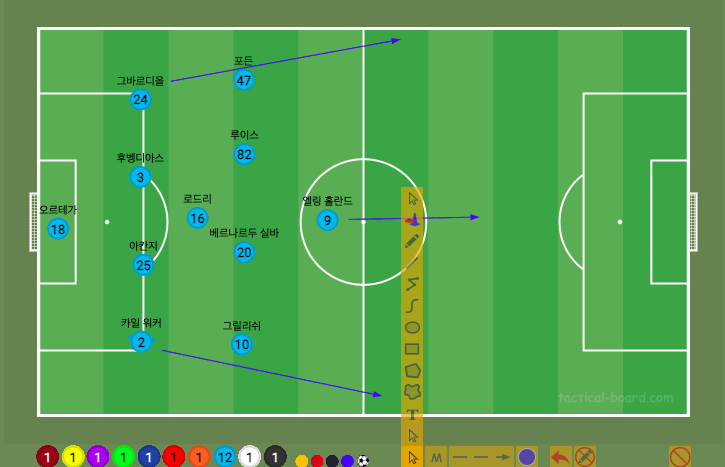 밑에 여러가지 색들로 이루어진 원들로 선수들 위치를 표시할 있고, 화살표를 통해서 선수들의 전술적 움직임을 표현할 수 있습니다.