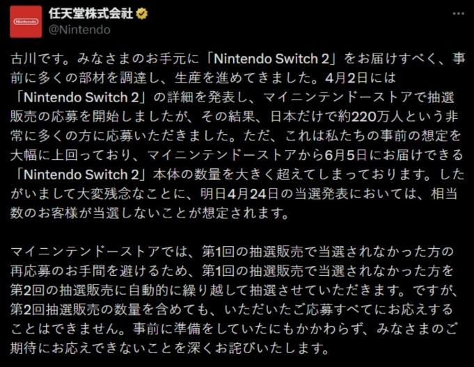 후루카와 슌타로 닌텐도 대표는 엑스(X, 구 트위터)를 통해 이 사실을 직접 알리며, 준비된 수량을 크게 초과한 신청자가 몰렸다고 밝혔습니다. 이로 인해 스위치2 사전 예약은 단순 선착순이 아닌 '추첨 방식'으로 진행되며, 1차 추첨에 탈락해도 2차 추첨에 자동 응모되는 시스템이 적용됩니다.