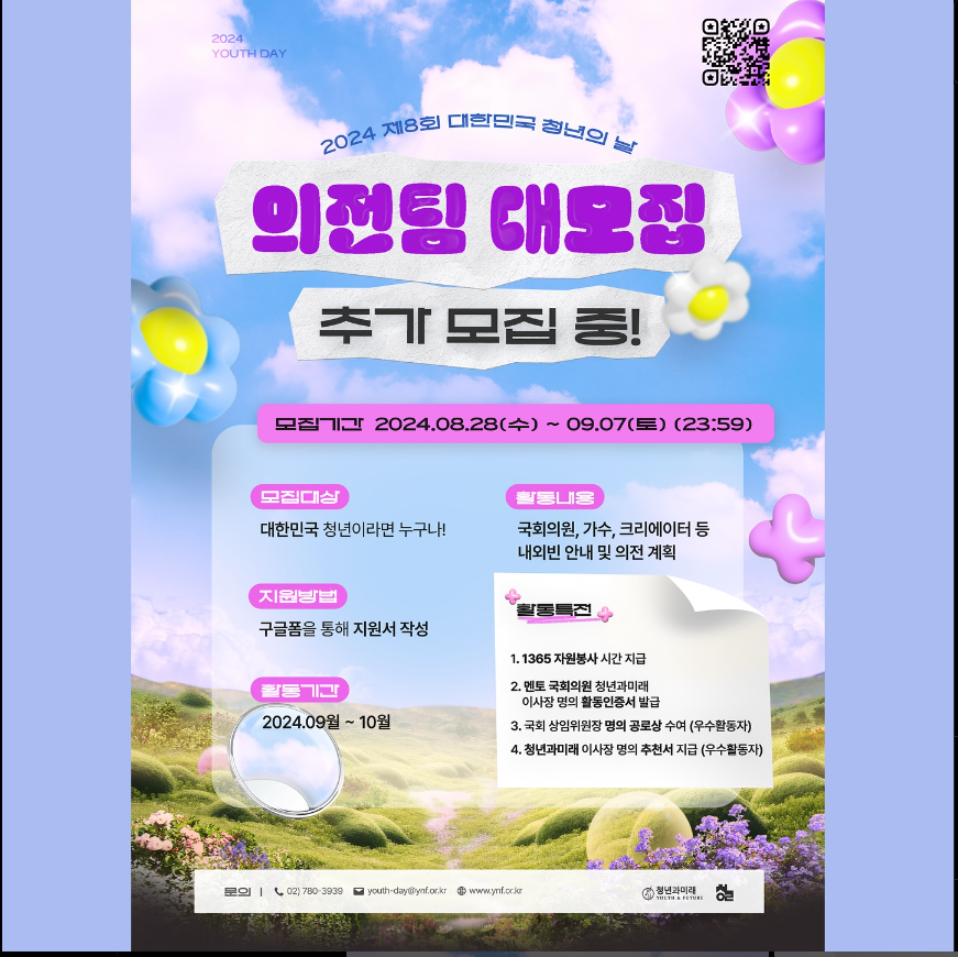 | <2024 제8회 대한민국 청년의 날> D-18 카드뉴스 소식 (1) | 2024.09.04 |