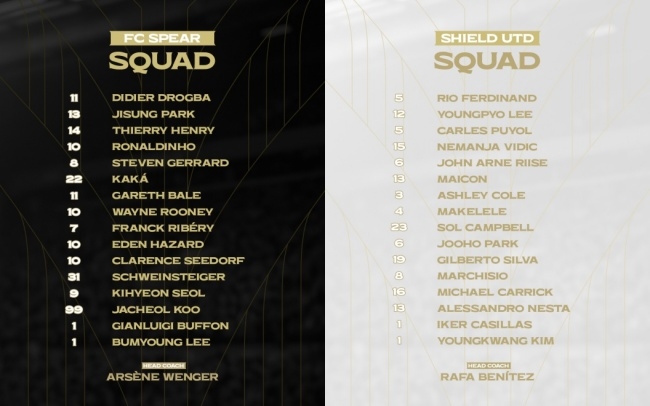 이로써 ‘FC 스피어’와 ‘실드 유나이티드’의 모든 선수와 감독 명단이 확정됐습니다. 아르센 벵거 감독이 이끄는 ‘FC 스피어’에는 앙리, 드로그바, 아자르, 카카, 루니, 리베리, 호나우지뉴, 베일, 제라드, 그리고 부폰까지 이름을 올렸습니다. 라파엘 베니테스 감독의 ‘실드 유나이티드’에는 카시야스, 마켈렐레, 마르키시오, 네스타, 마이콘, 캐릭, 퍼디난드, 비디치, 푸욜, 리세 등이 포함되어 그야말로 2000년대 세계 축구를 대표하는 레전드들이 총출동하는 그림이 완성됐습니다.