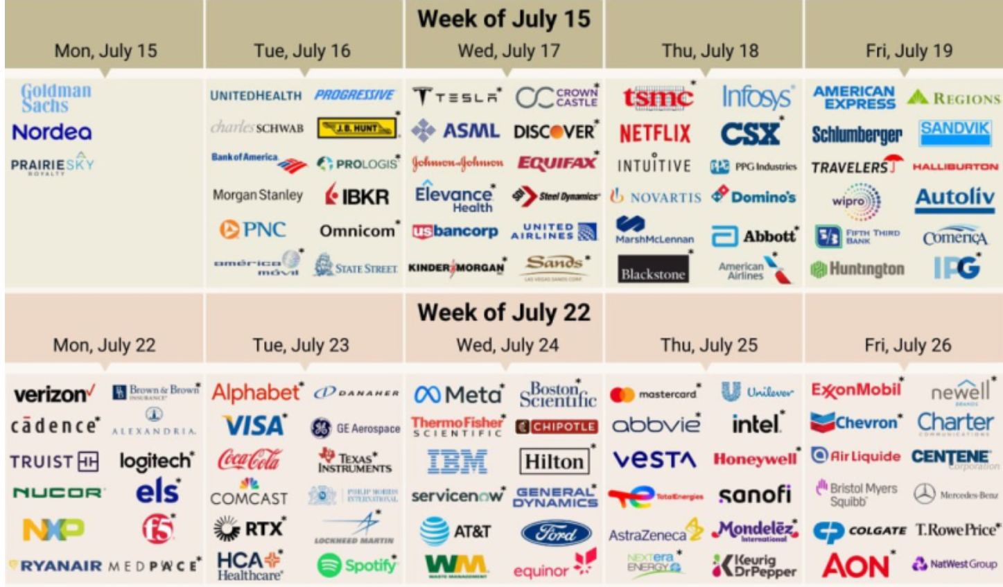 주요 기업으로는 7월 18일 개장 전 TSMC 실적 발표 마감 후 넷플릭스 공개가 있을 예정입니다.