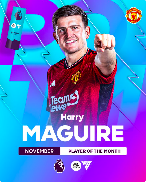 잉글랜드 프리미어리그(EPL) 사무국은 10일 공식 홈페이지에서 "2023/24시즌 캐스트롤 EPL 이달의 선수상과 감독상의 11월 수상자로 맨체스터 유나이티드의 수비수와 감독인 해리 매과이어와 에릭 텐 하흐가 선정되었다.