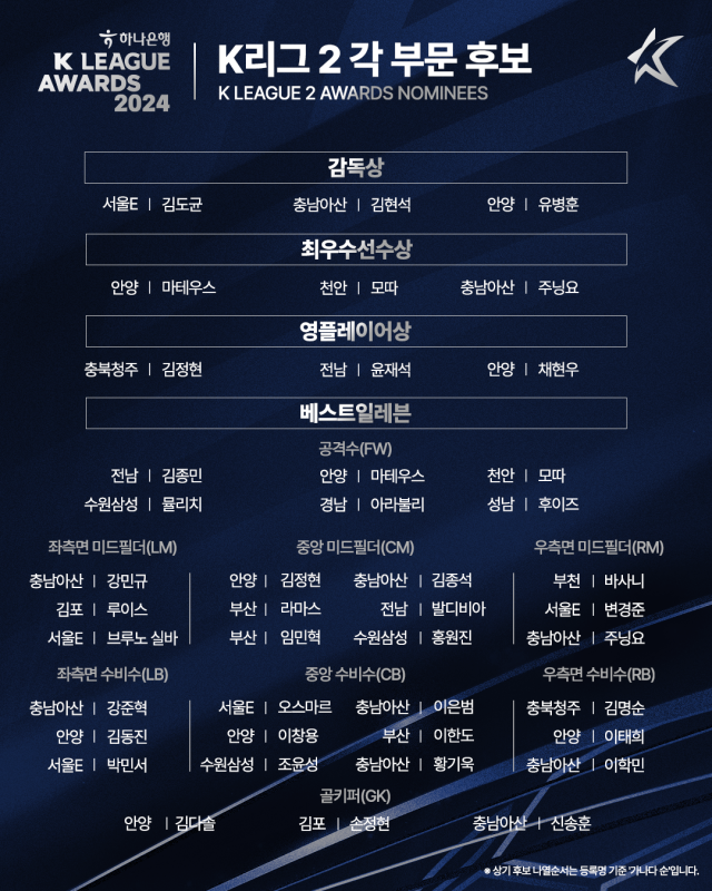 한국프로축구연맹이 ‘하나은행 K리그 2024 대상 시상식’을 앞두고 K리그1과 K리그2 개인상 후보를 발표했습니다. 후보는 연맹 기술위원회, 기자, 해설위원 등 전문가들의 검토를 거쳐 선정됐으며, 투표는 구단 감독(30%), 주장(30%), 미디어(40%)의 비율로 진행됩니다.