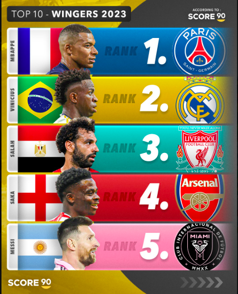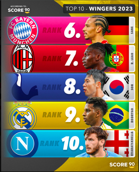 오늘은 2023년 활약한 윙어 선수들중 탑 10에 뽑힌 선수들을 소개해 보겠습니다. 주요 선수들을 위주로 소개해드리고 10위부터 크바라첼리아 (나폴리), 호드리구 (레알 마드리드), 손흥민 (토트넘 홋스퍼), 라파엘 레앙 (AC 밀란), 르로이 사네 (바이에른 뮌헨), 리오넬 메시(마이에미), 부카요 사카 (아스날), 모하메드 살라(리버풀), 비니시우스 (브라질), 킬리안 음바페 (파리) 순으로 선정 되었습니다. 주요 선수들 중심으로 소개해보겠습니다.